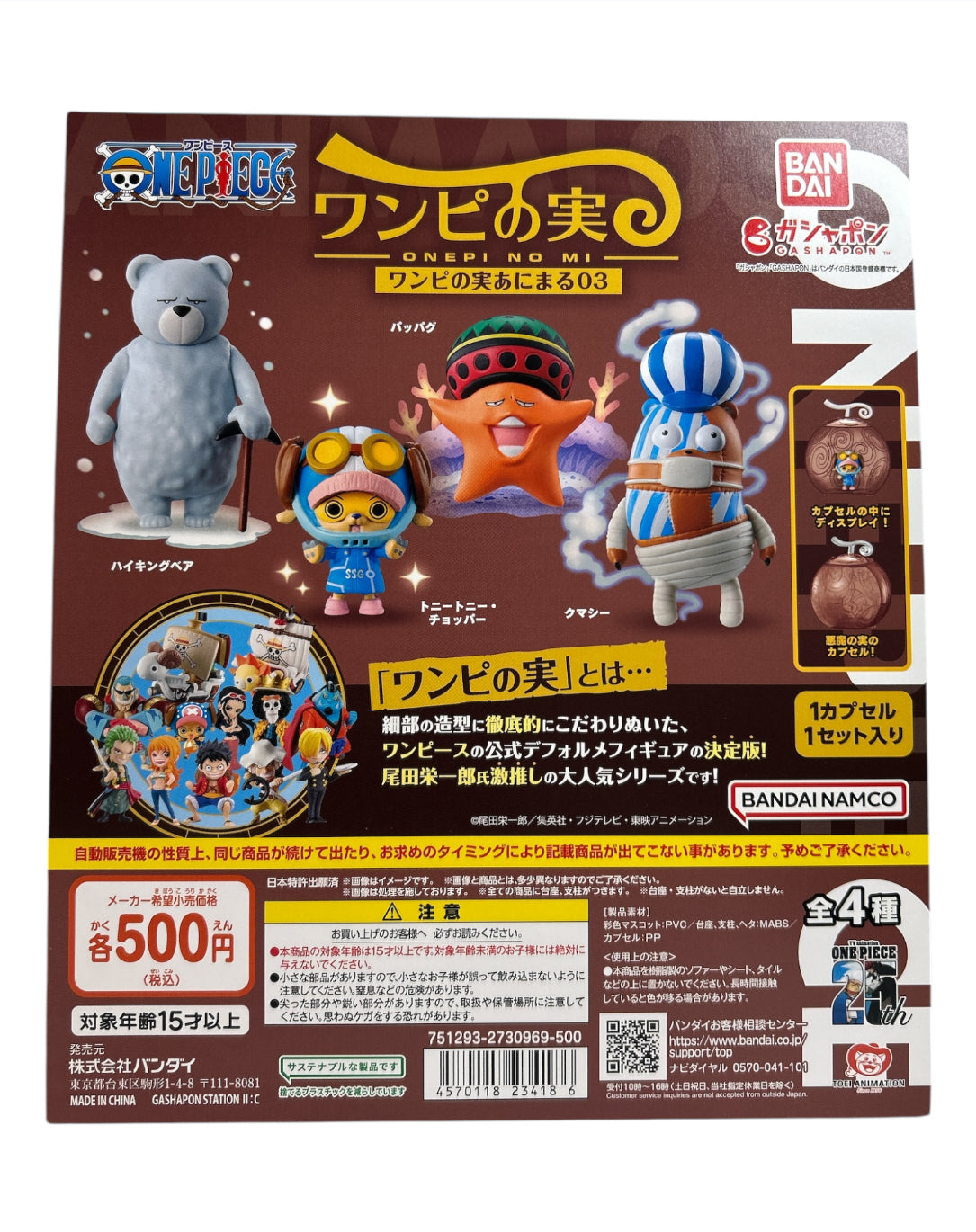 Collect your favorite One Piece characters with our Devil Fruit Gashapon capsules! Featuring Tony Tony Chopper, Bappag, Kumashi, and Hiking Bear, each capsule contains a surprise character inside. Perfect for fans of the hit anime series. Get yours now!